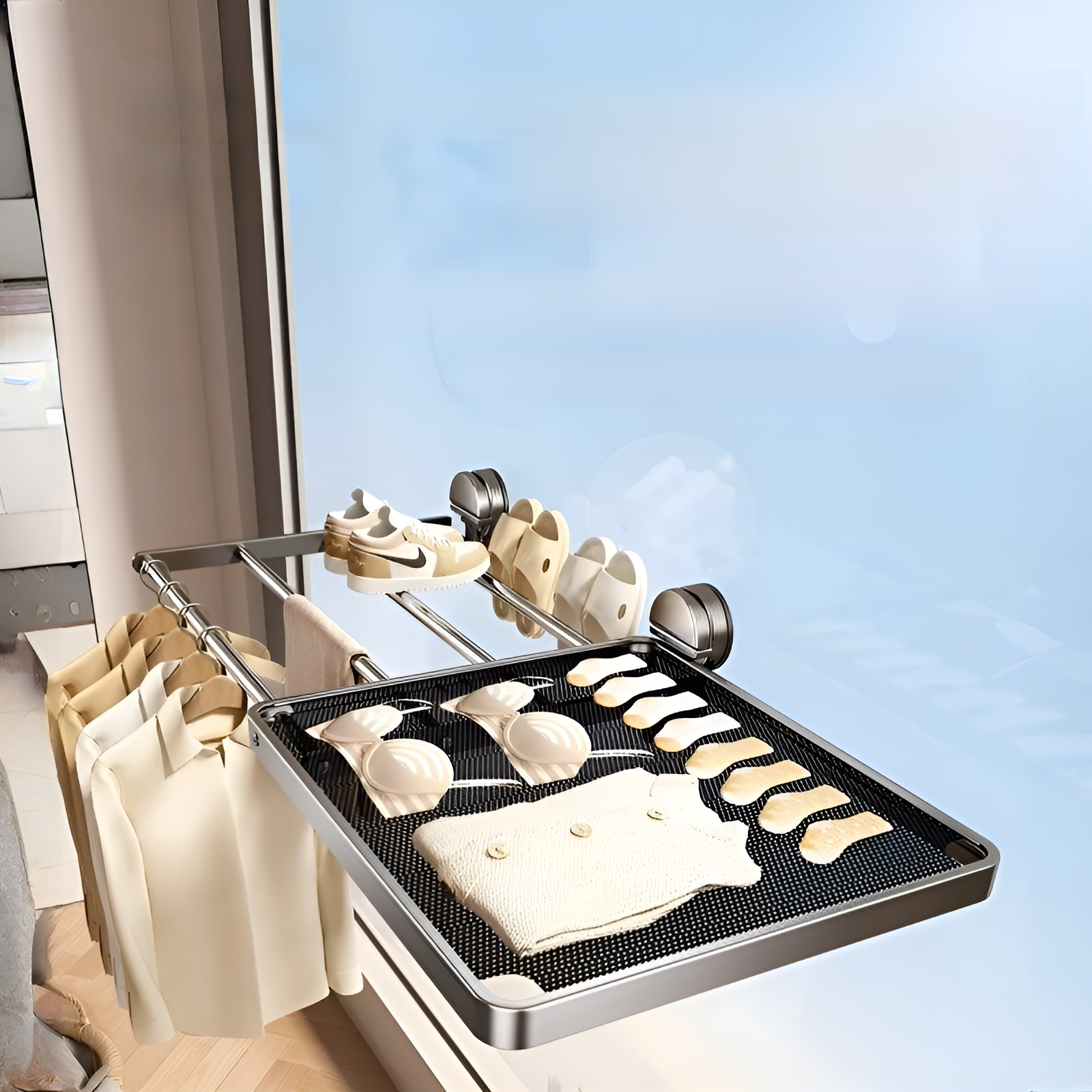 ● Instalación fácil y sin herramientas gracias a su adhesivo resistente, ideal para quienes viven en pisos de alquiler y no pueden realizar agujeros. ● Diseño compacto y discreto para ventanas, ahorra espacio y permite secar la ropa sin ocupar zonas comunes del hogar. ● Material duradero y alta capacidad de carga, soporta varias prendas a la vez, perfecto para el uso diario en apartamentos. ● Se puede retirar sin dejar marcas ni daños, protegiendo la integridad de la vivienda y facilitando la mudanza. ● Permite aprovechar la luz solar directa en la ventana, acelerando el secado de la ropa y ayudando a ahorrar energía.